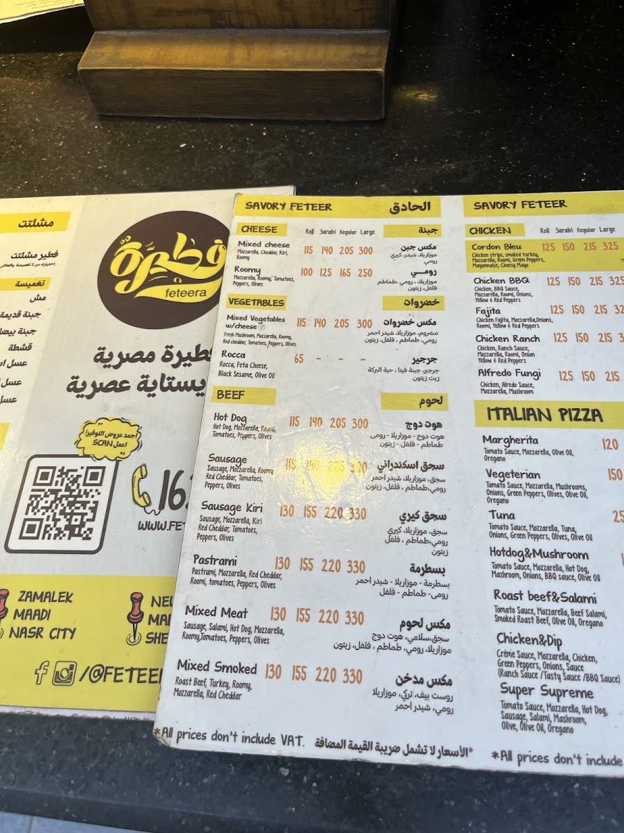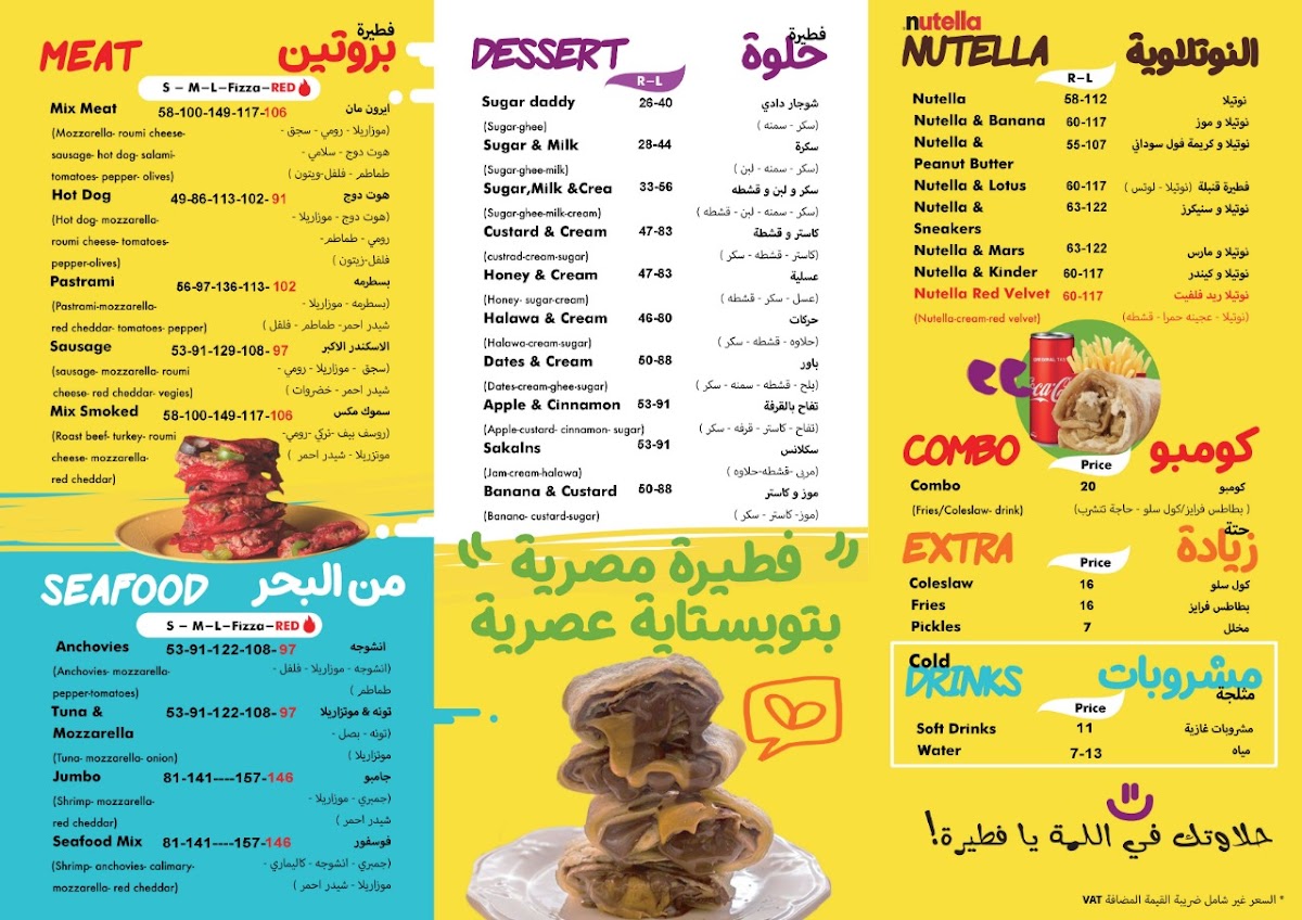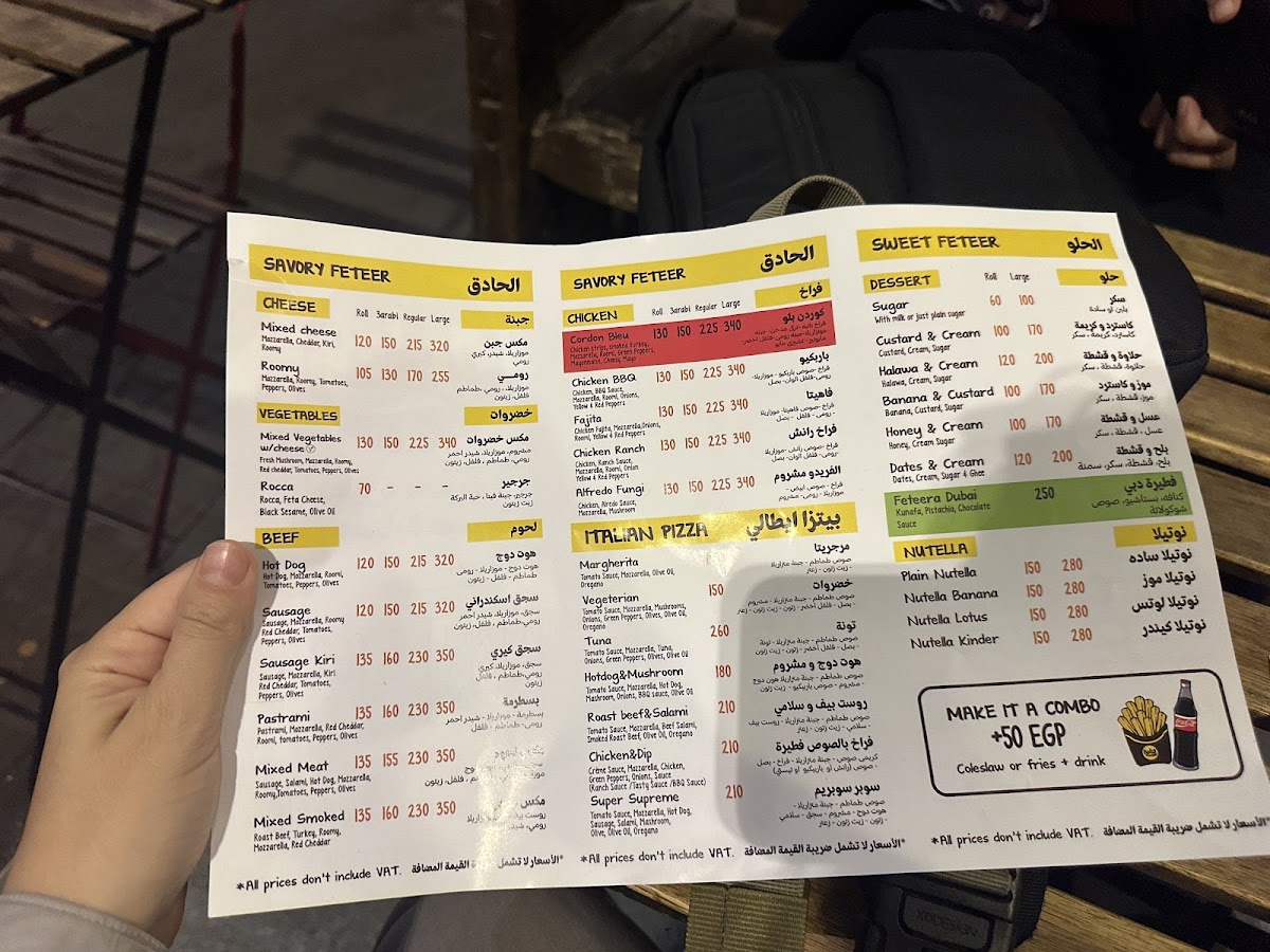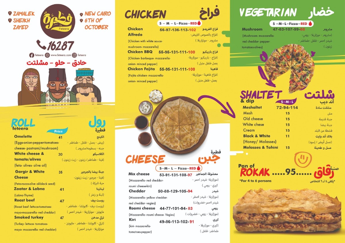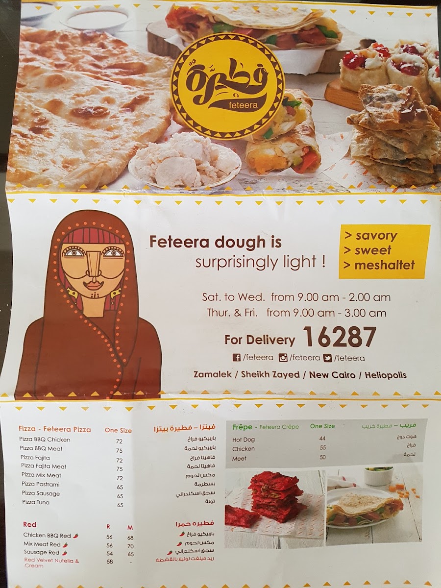 Tucked along 26 July St in Al Gabalayah, Zamalek, the Feteera Menu feels like a warm invitation to explore Egypt’s most comforting flavors. From the very first glance, it’s clear this isn’t just about a quick bite - it’s about choosing your mood. Craving something savory? The classic feteer meshaltet comes layered, flaky, and golden, with fillings that range from perfectly seasoned minced meat to gooey, stretchy cheese blends. Prefer something sweet? There’s a whole side of the menu dedicated to indulgence, with honey, sugar, Nutella, and fresh fruit turning that same crispy pastry into a dessert worth lingering over.